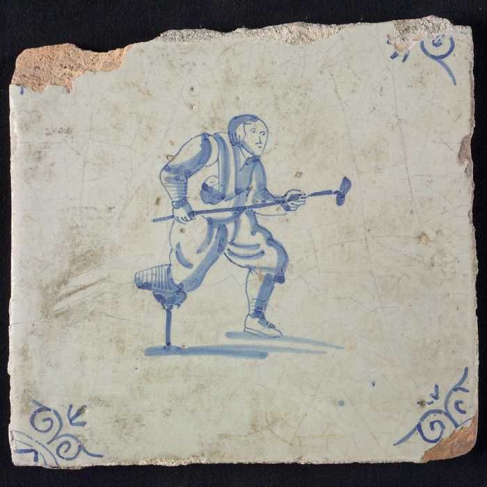 Figuurtegel, man met houten been en een kruk, hoekmo...
