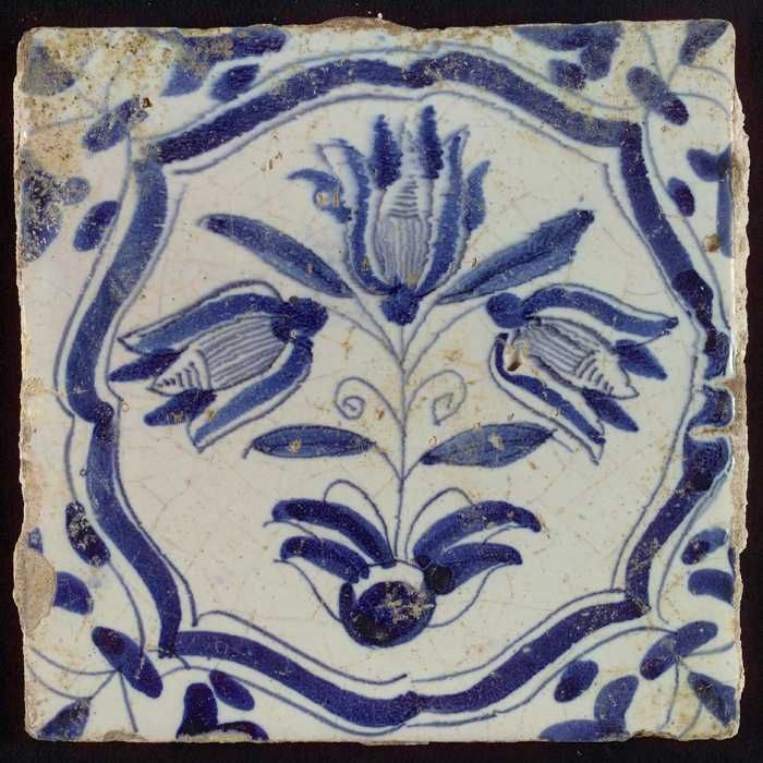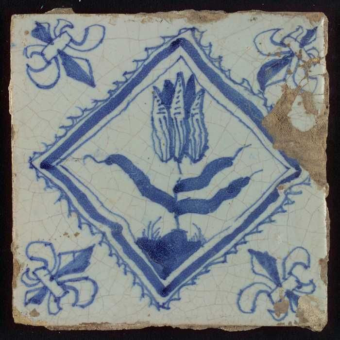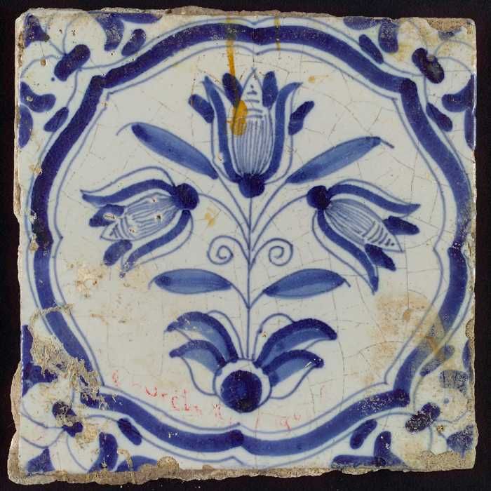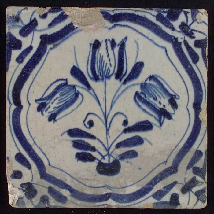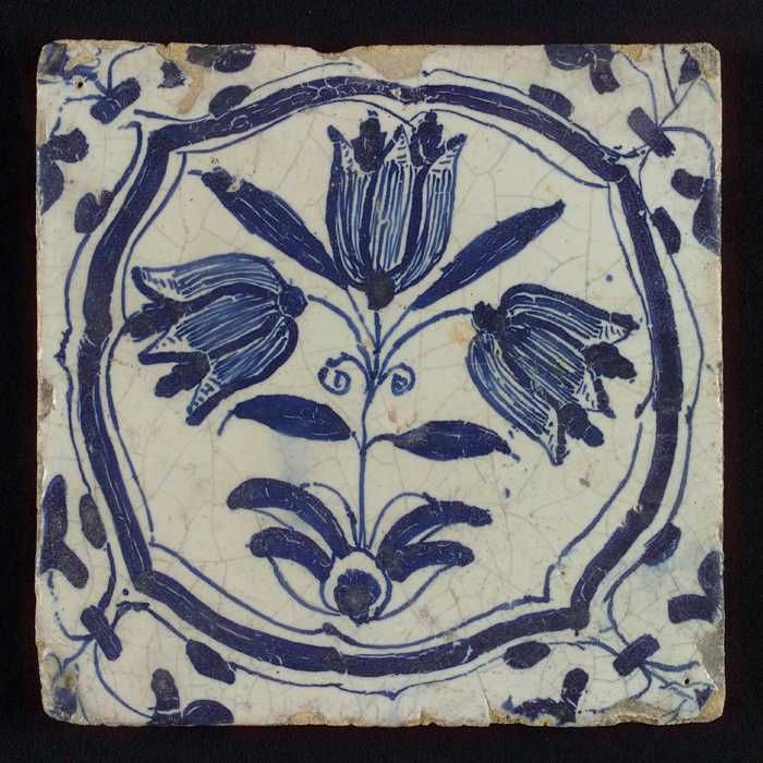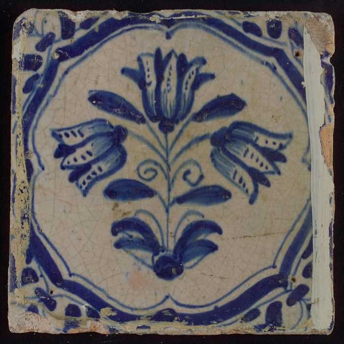 Tegel, drietulp in accolades in blauw op wit, hoekmo...