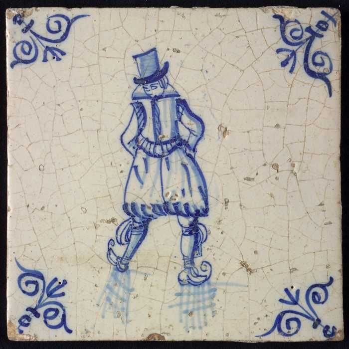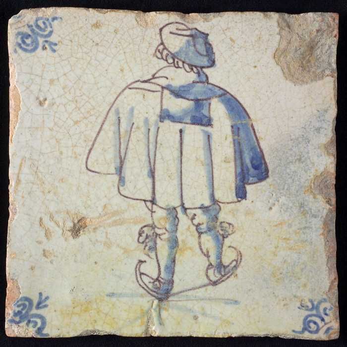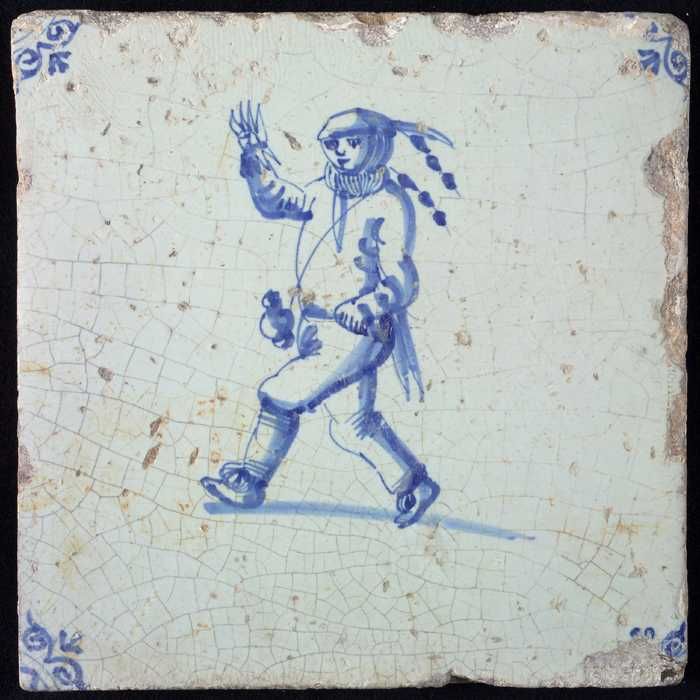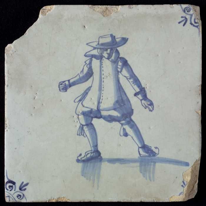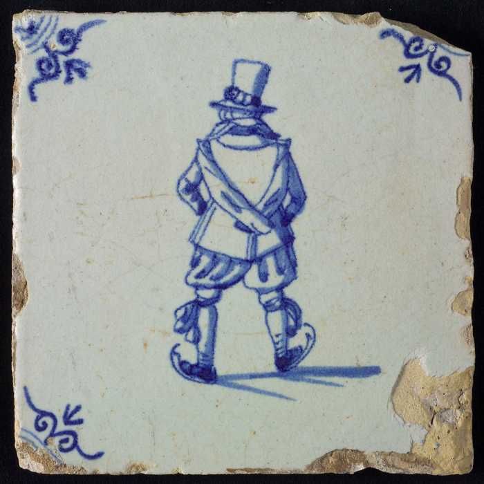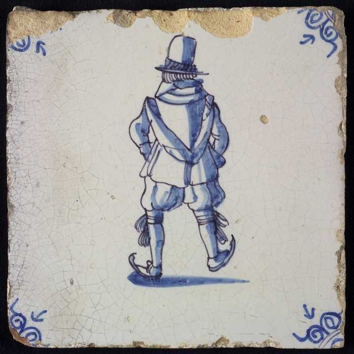 Figuurtegel, blauw, schaatsende man met grote hoed, ...