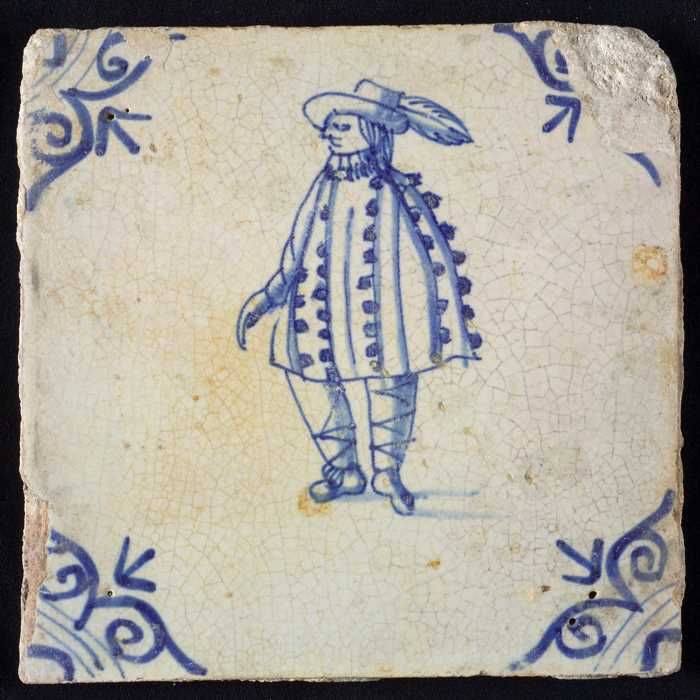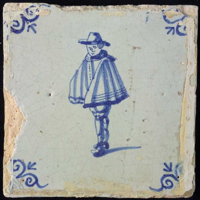 Figuurtegel, blauw, staande edelman met iets in de h...