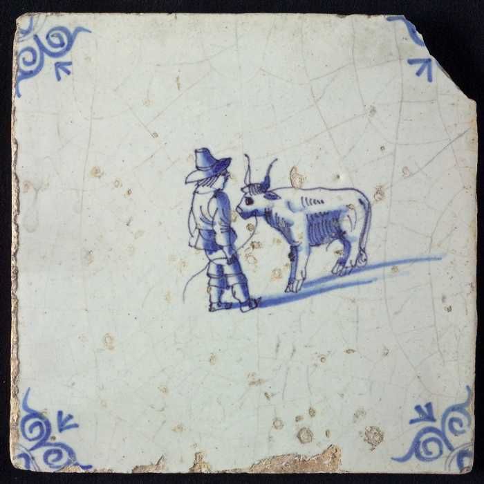 Figuurtegel, blauw, boer met een rund, hoekmotief os...