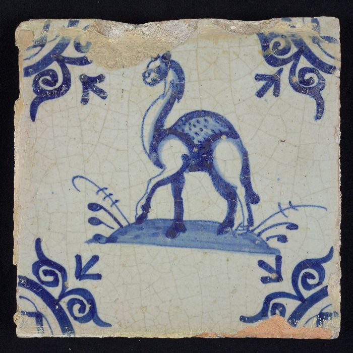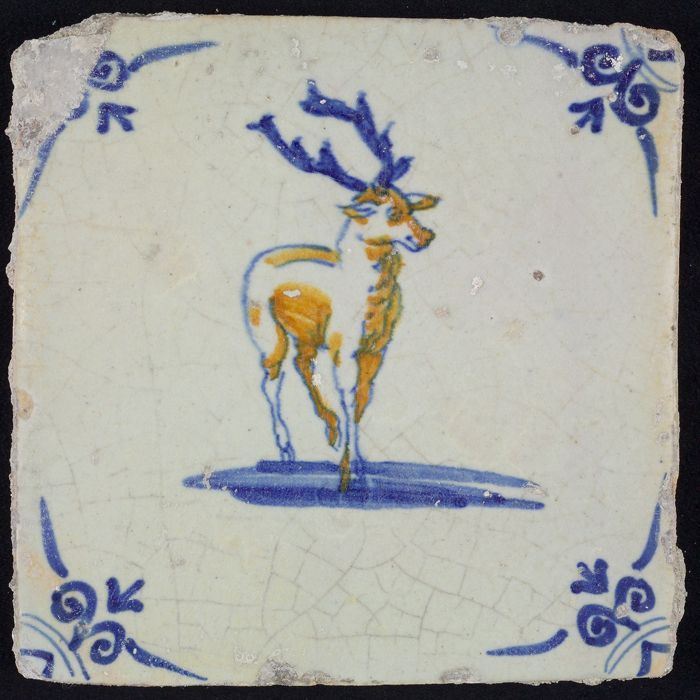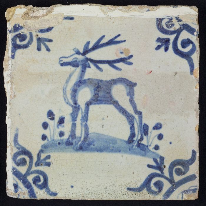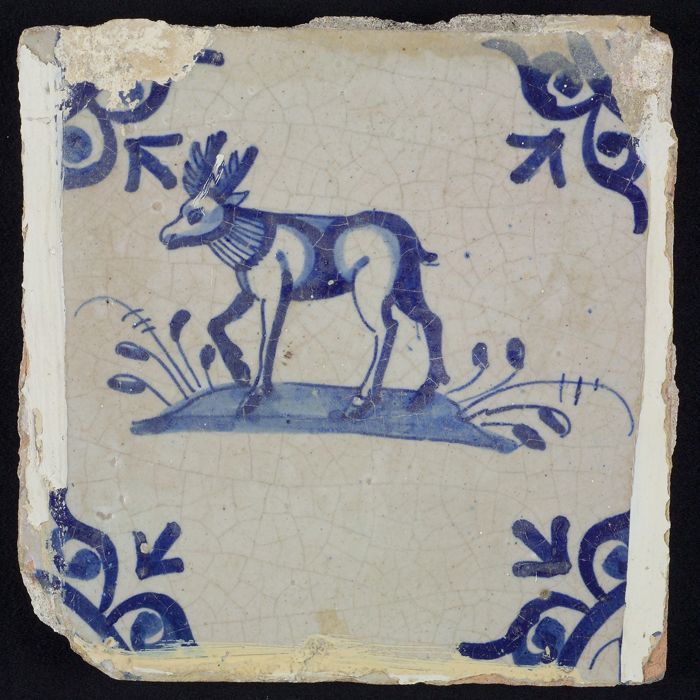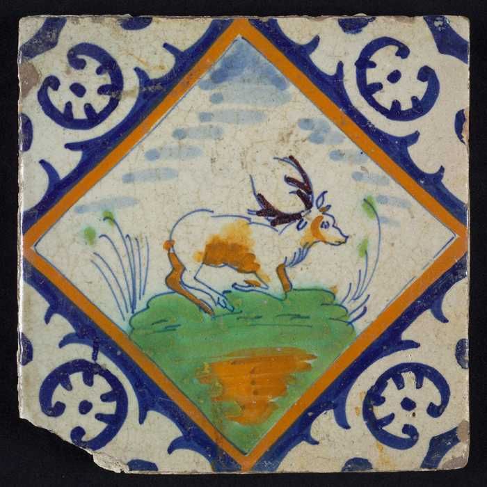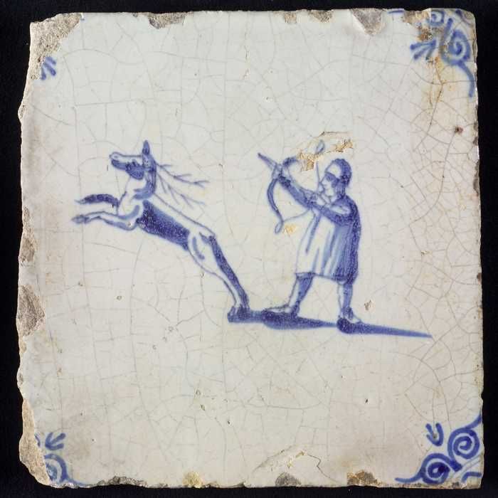 Figuurtegel, blauw, jager schiet op hert, hoekmotief...
