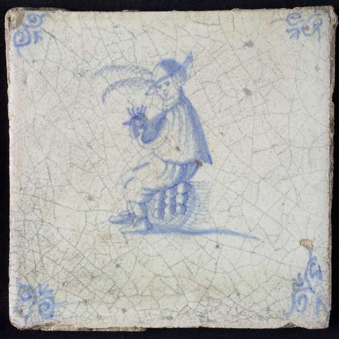 Figuurtegel, blauw, man met een nopjescape, hoekmoti...