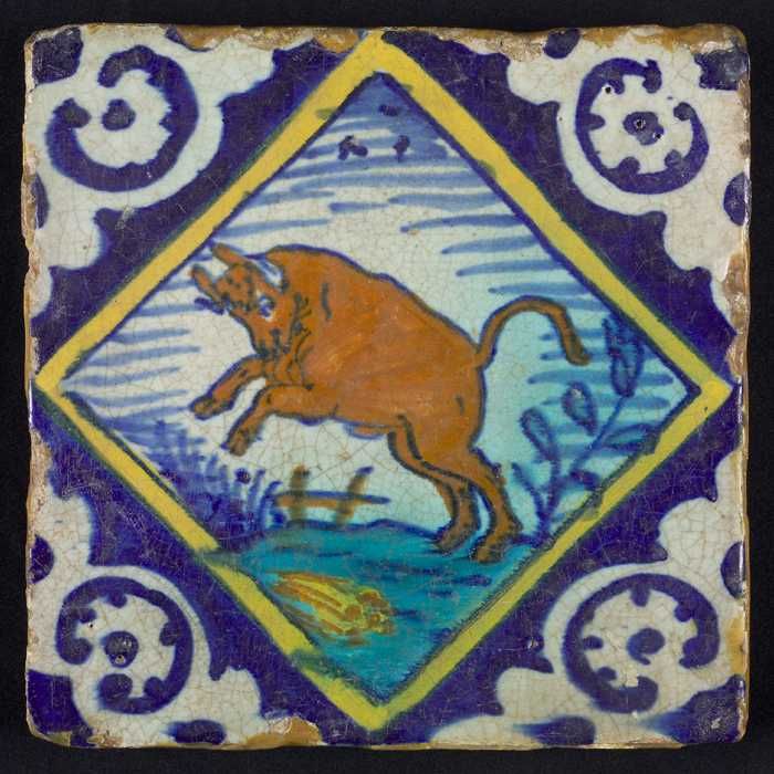 Dierentegel, aanvallende stier, hoekmotief ossenkop