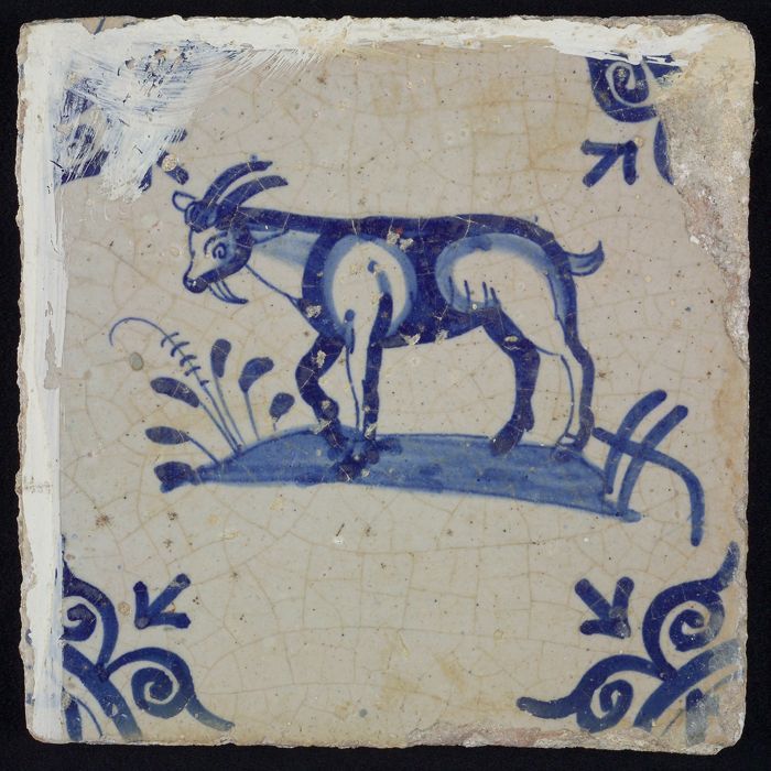 Dierentegel, bok op grondje, hoekmotief grote ossenkop