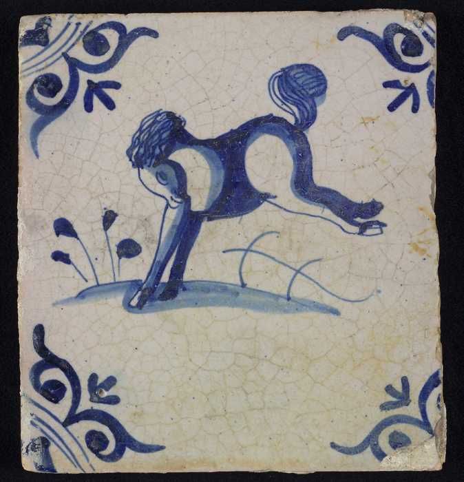 Figuurtegel, blauw, staande edelman, hoekmotief osse...