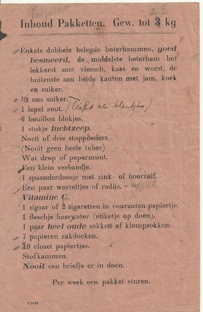 Inhoud pakketten - gew. tot 3 kg gevangenenkamp Vught