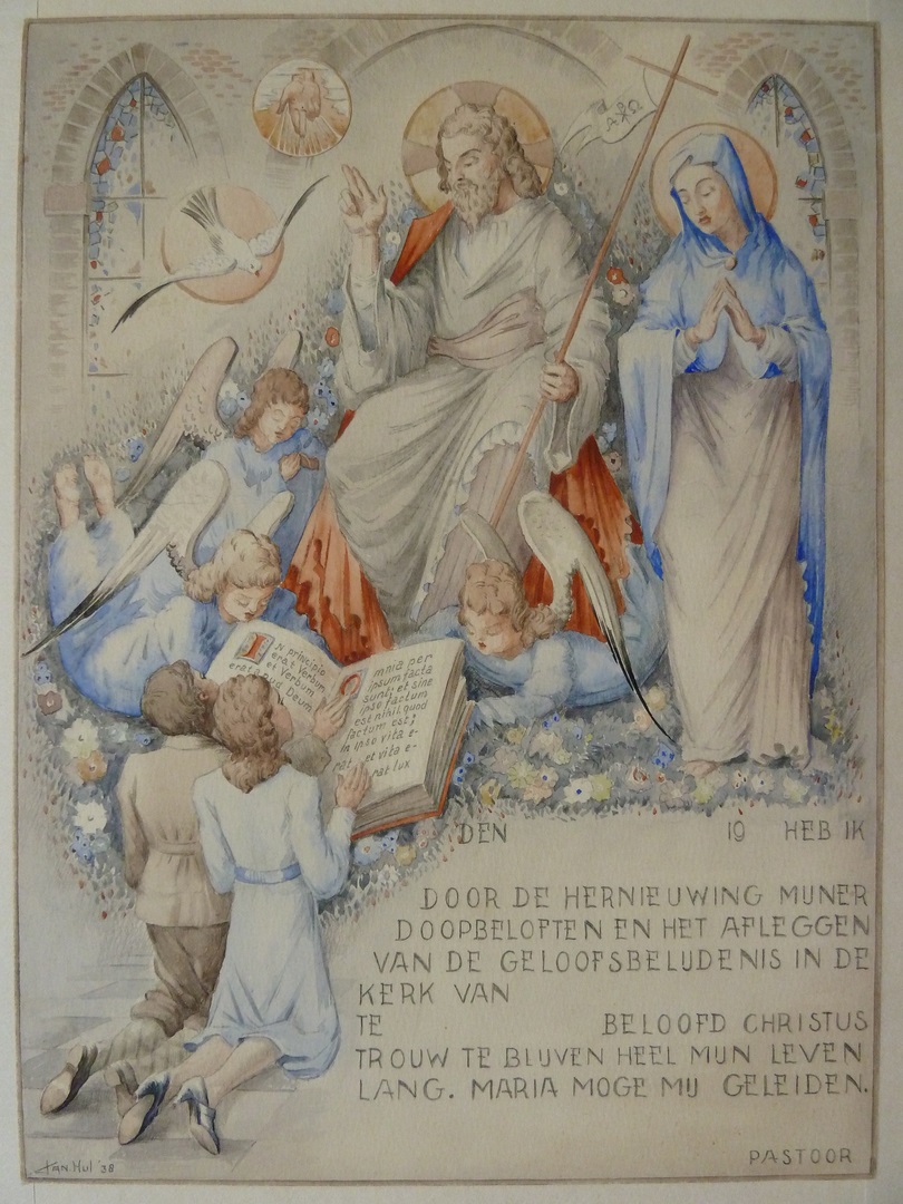 Ontwerp geloofsbelijdenisplaat met man en vrouw gekn...