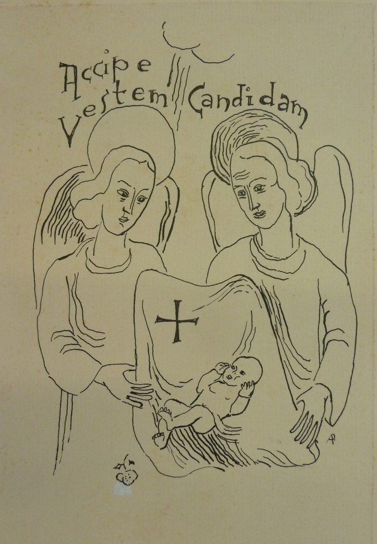 Ontwerp doopplaatje met twee engelen met doek waarop...