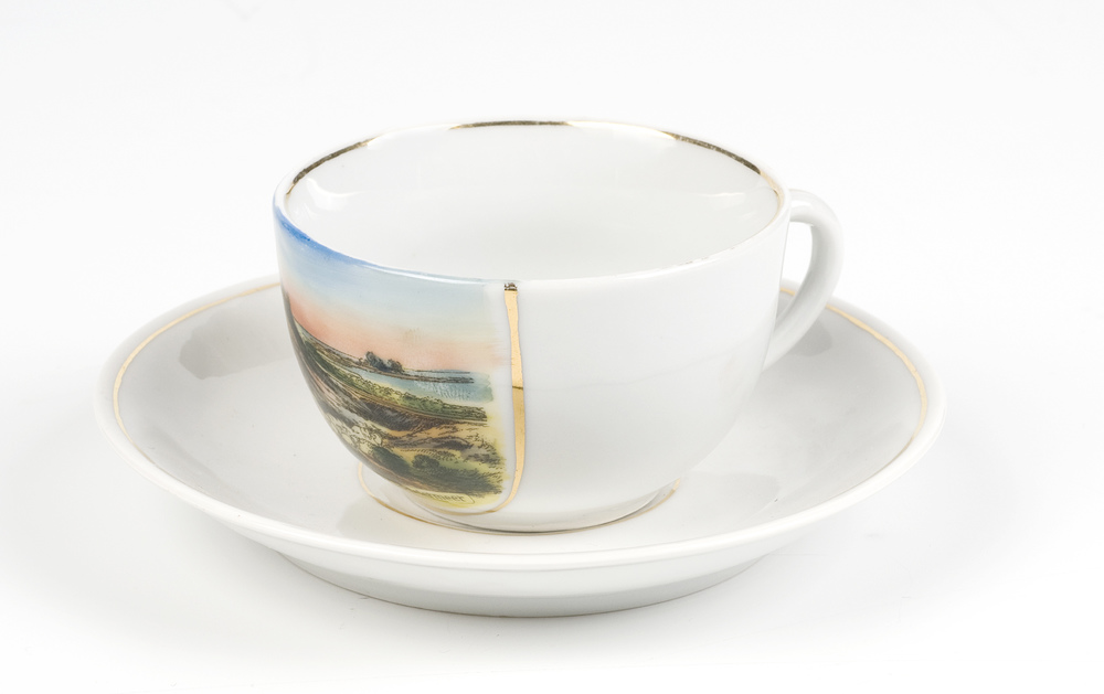 Herinneringskop en schotel van keramiek met afbeeldi...