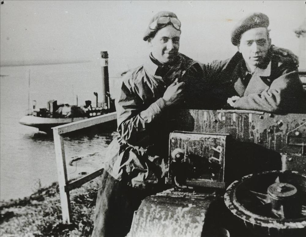 Foto twee piloten in cockpit van Britse Short Stirli...
