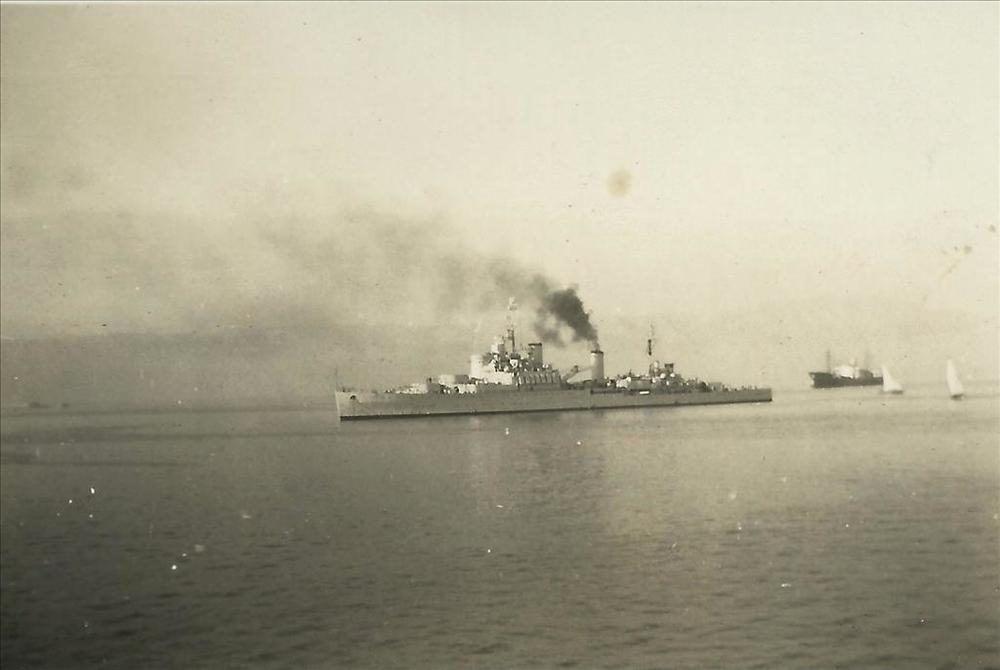 Nederlands Indië; kruiser, anker, rede, vrachtschip,...