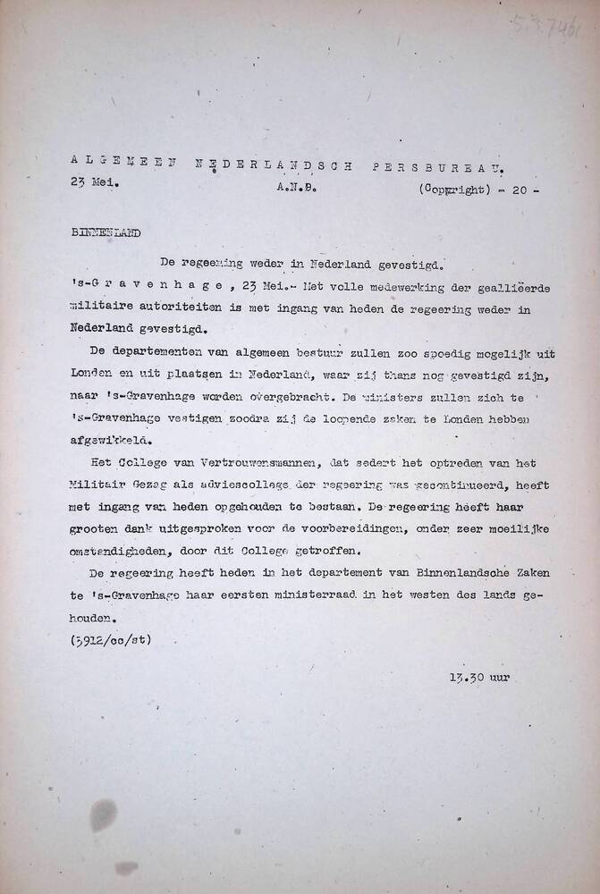 Algemeen Nederlandsch Persbureau, mededelingen, 23 m...