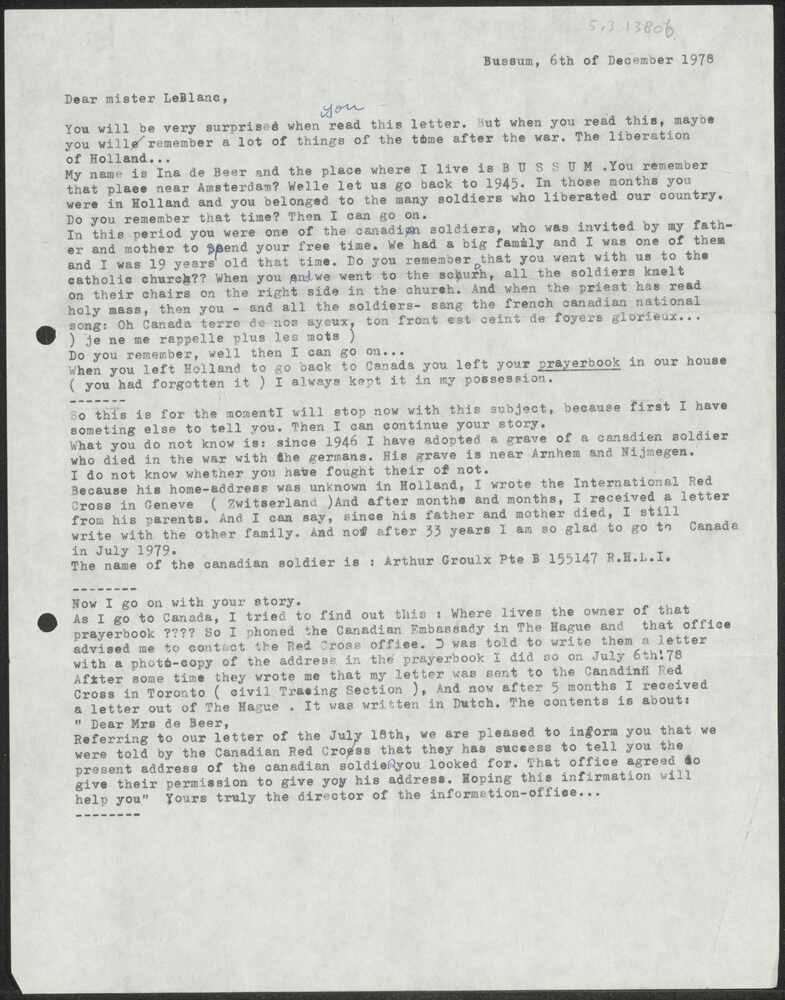 Afschrift van brief van I. de Beer aan Armand LeBlanc,