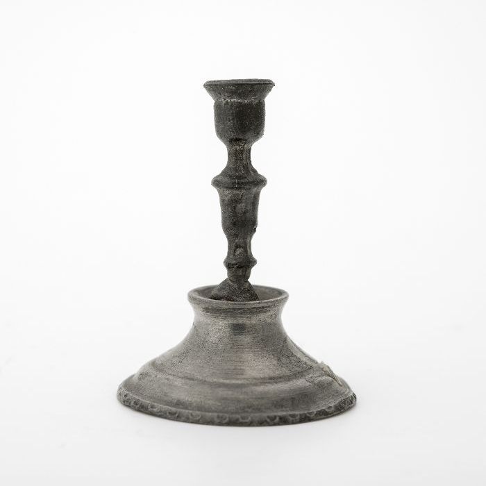 Tinnen miniatuur kandelaar met smalle kaarshouder op...