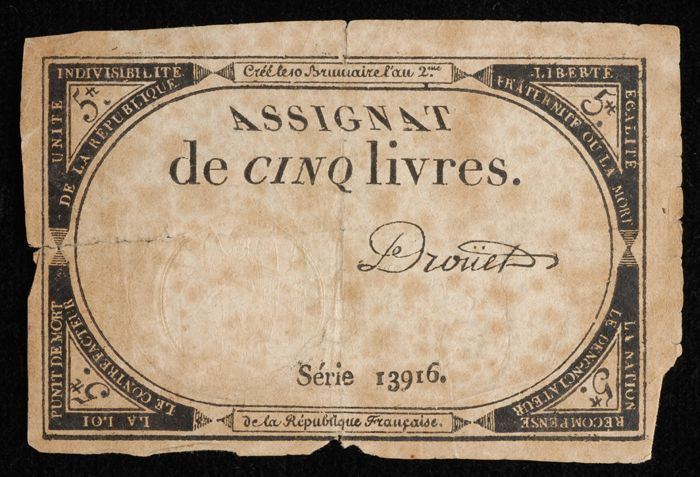 Assignaat van "cinq livres", met sierrand waarin tekst