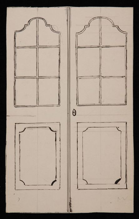 Tekening in zwart-wit van twee kastdeuren met zes ru...