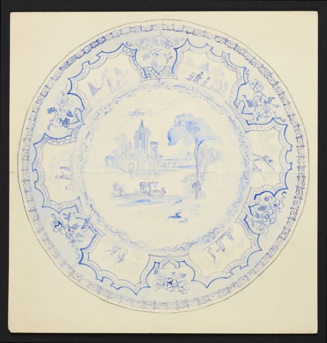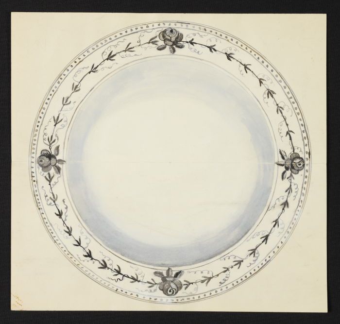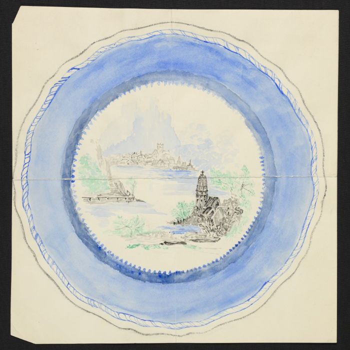 Aquarel met rond porseleinen bord met tafereeltjes o...