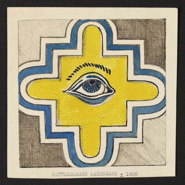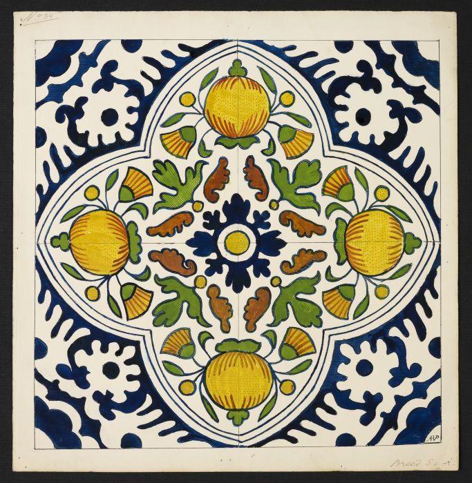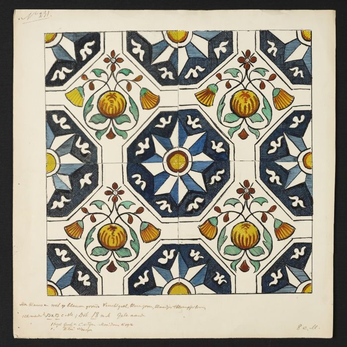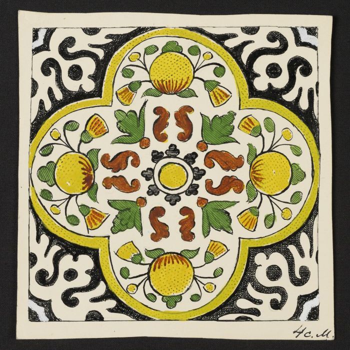 Ingekleurde tekening met ontwerp van tegel, in geel ...