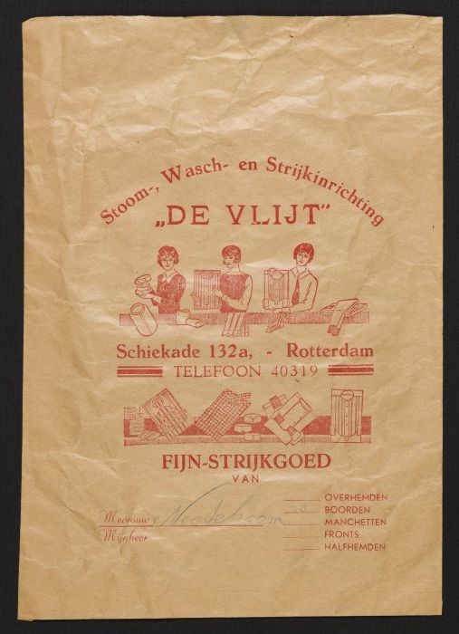 Papieren zak met in rood "Stoom-, Wasch,- en Strijki...