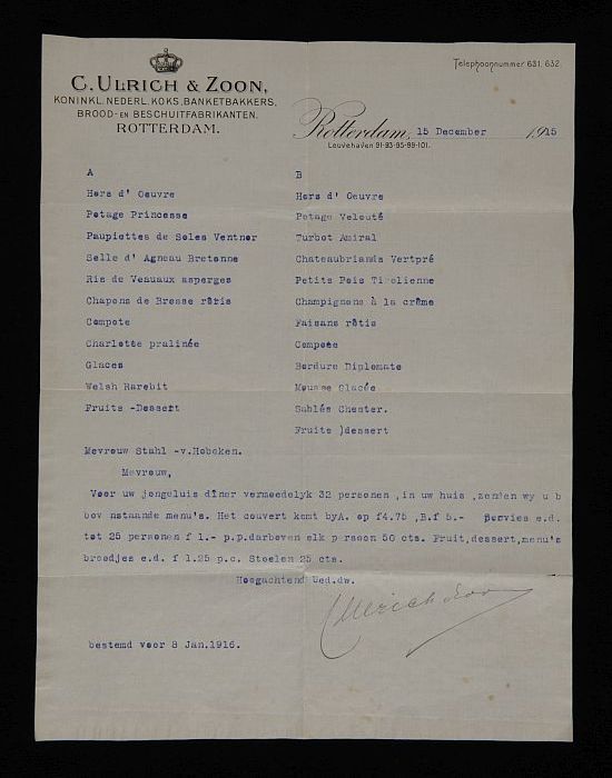 Brief met menu's voor een "jongeluis diner vermoedel...