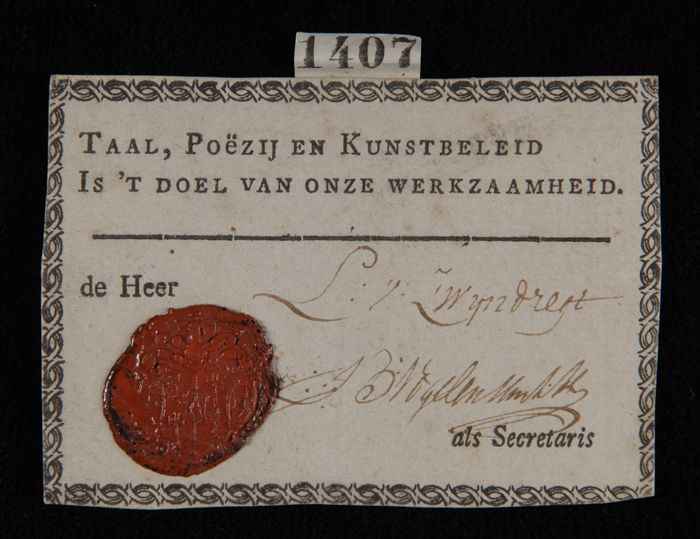 Lidmaatschapsbewijs met opdruk "Taal, poëzij en kuns...