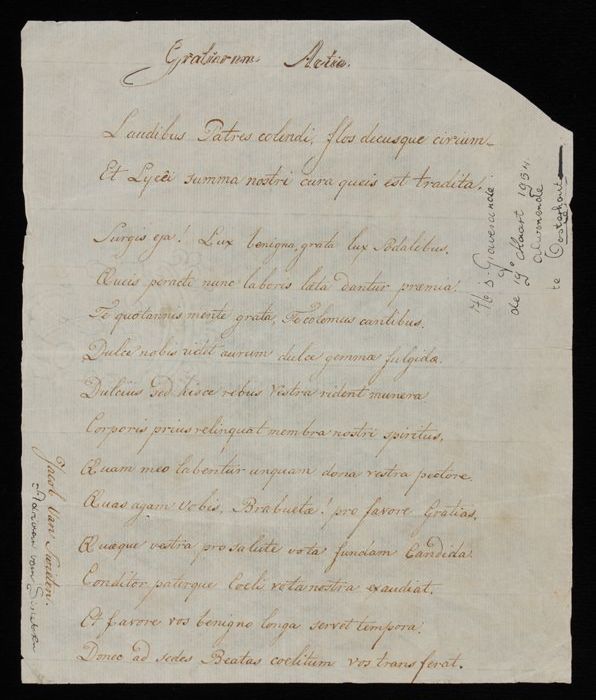 Handgeschreven lofzang "Gratiarum Actio", in het Lat...