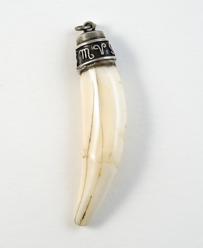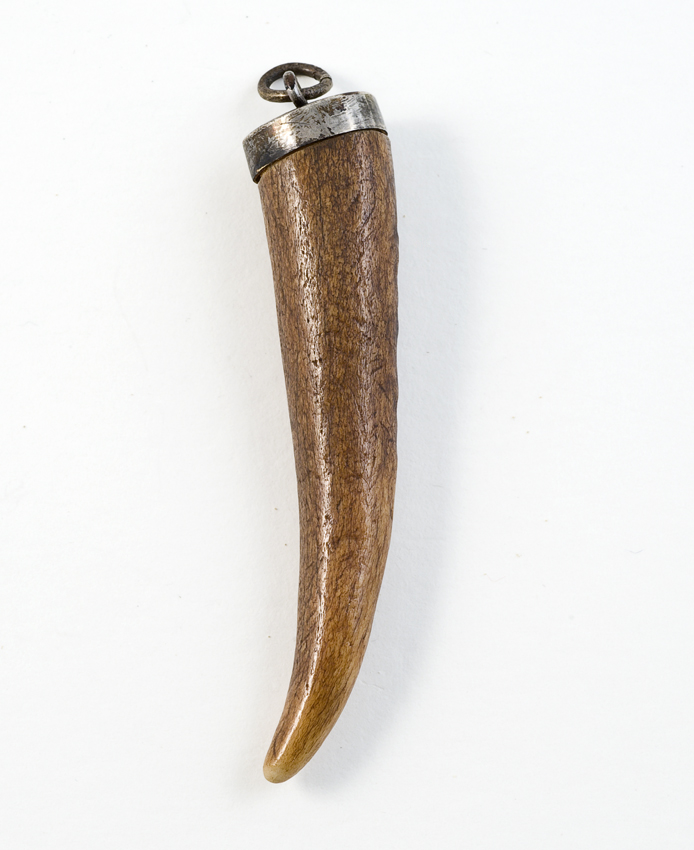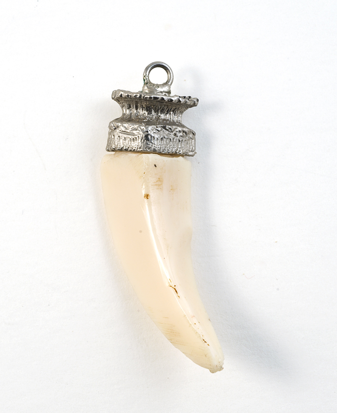 Tand of hoornvormige amulet in metalen zetting