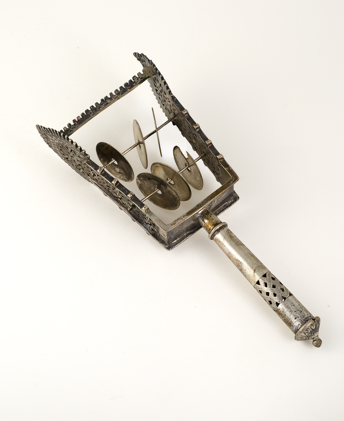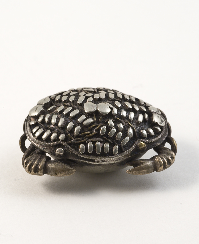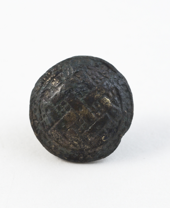 Metalen amulet. halve bolvorm met decoratie in ruitp...