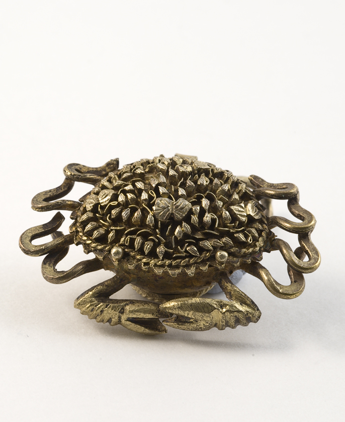 Opengewerkte en halfronde metalen amulet met spirale...