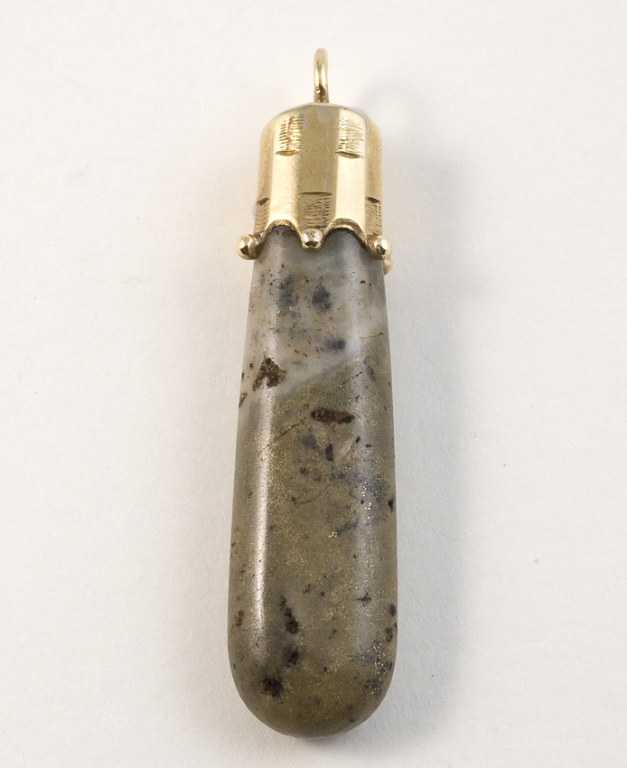 Amulet van grijs edelsteen met goudkleurige zetting