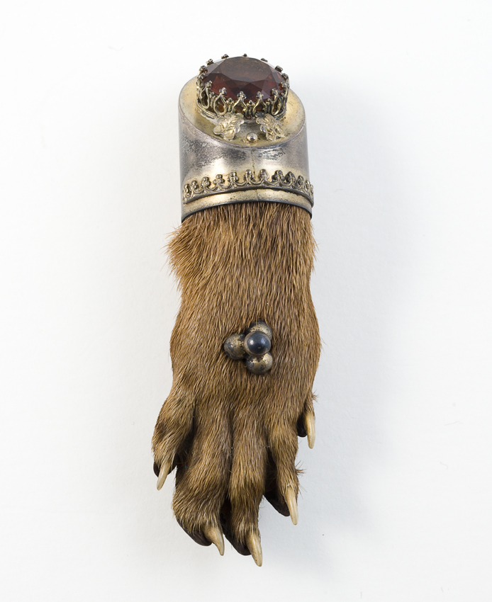 Dierenpoot amulet in cilindrische metalen houder