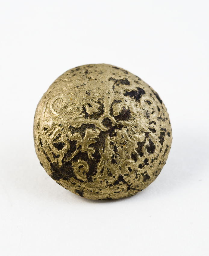 Bolvormige metalen amulet met goudkleurige decoratie.