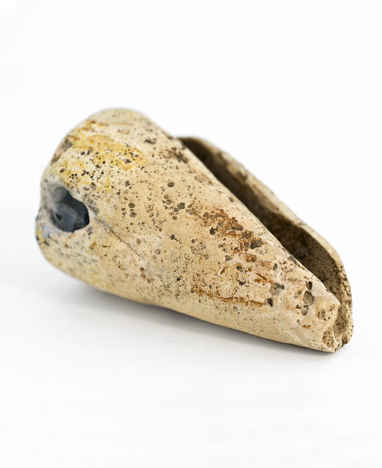 Prehistorische terracotta schelp rammelaar