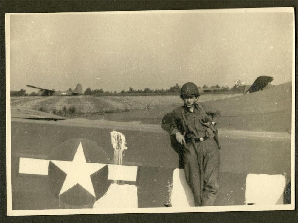 Amerikaanse parachutist leunt tegen een Waco glider,...
