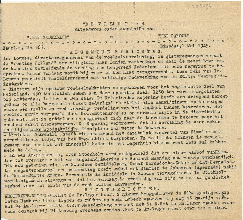 De Vrije Pers, Haarlem, No 166, 1 mei 1945