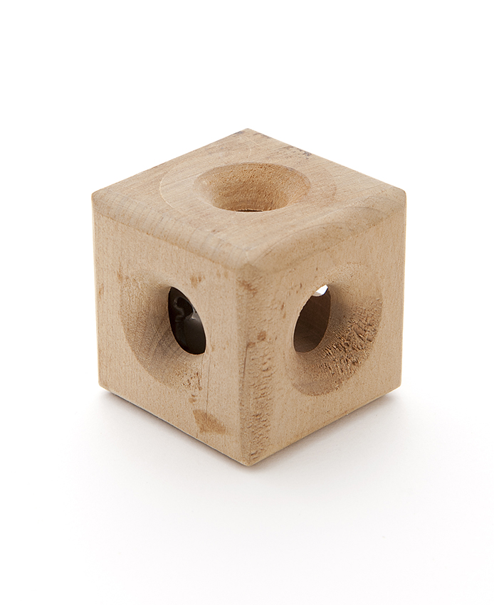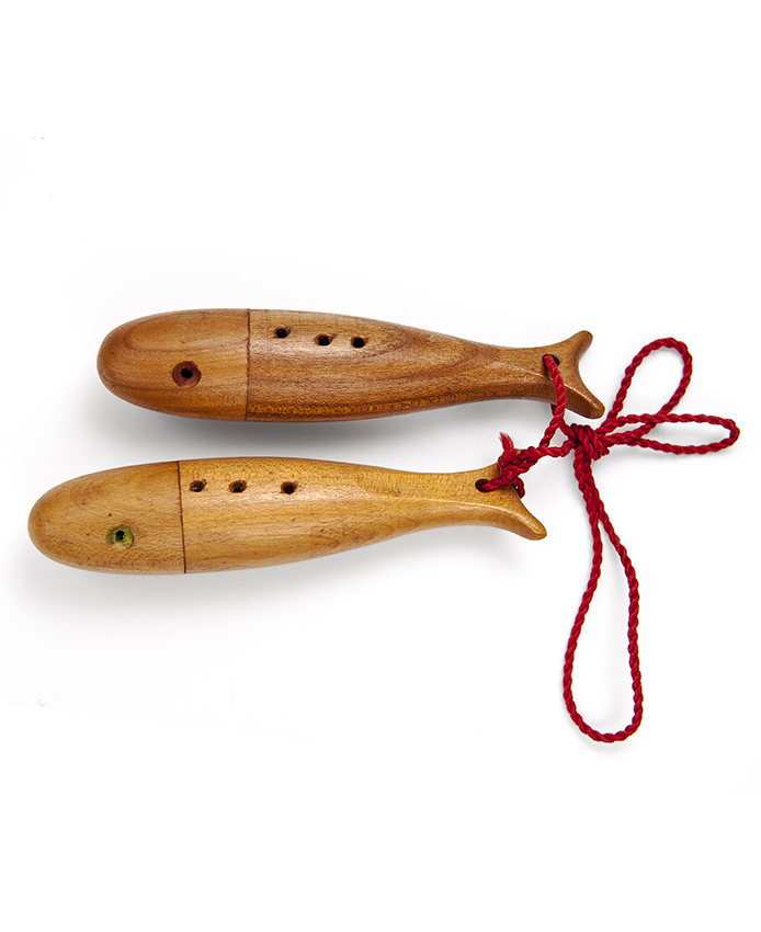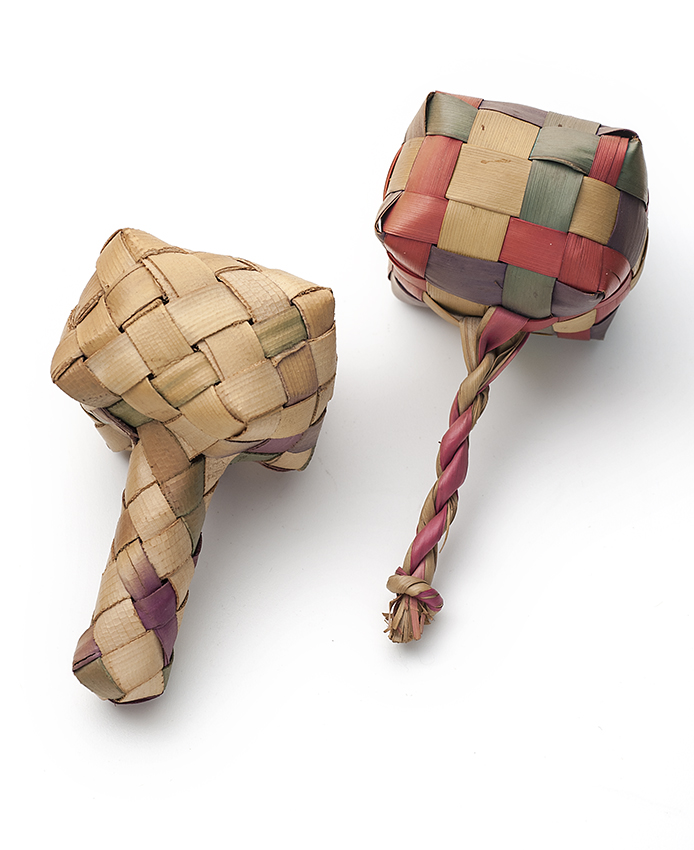Twee rammelaars en kubus van gekleurd en gevlochten ...