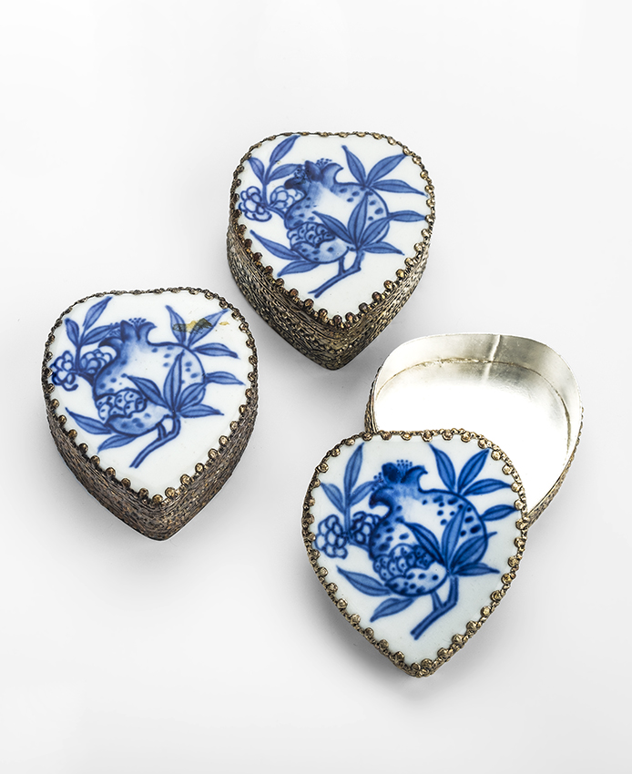 Drie hartvormige sterling zilver en porceleinen doosjes