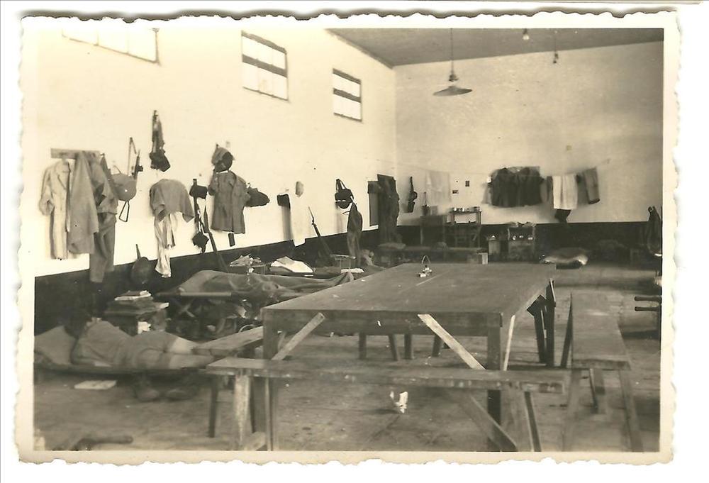 Zaal met tafels en mannen slapende op uitklapbedden,...