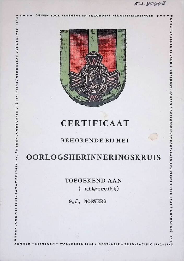 Certificaat behorende bij het oorlogsherinneringskruis.