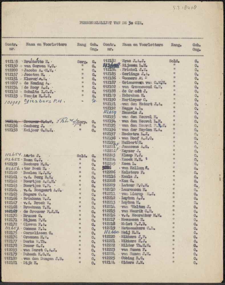 Personeelslijst van de 3e Cie (is: 3de Compagnie, Is...
