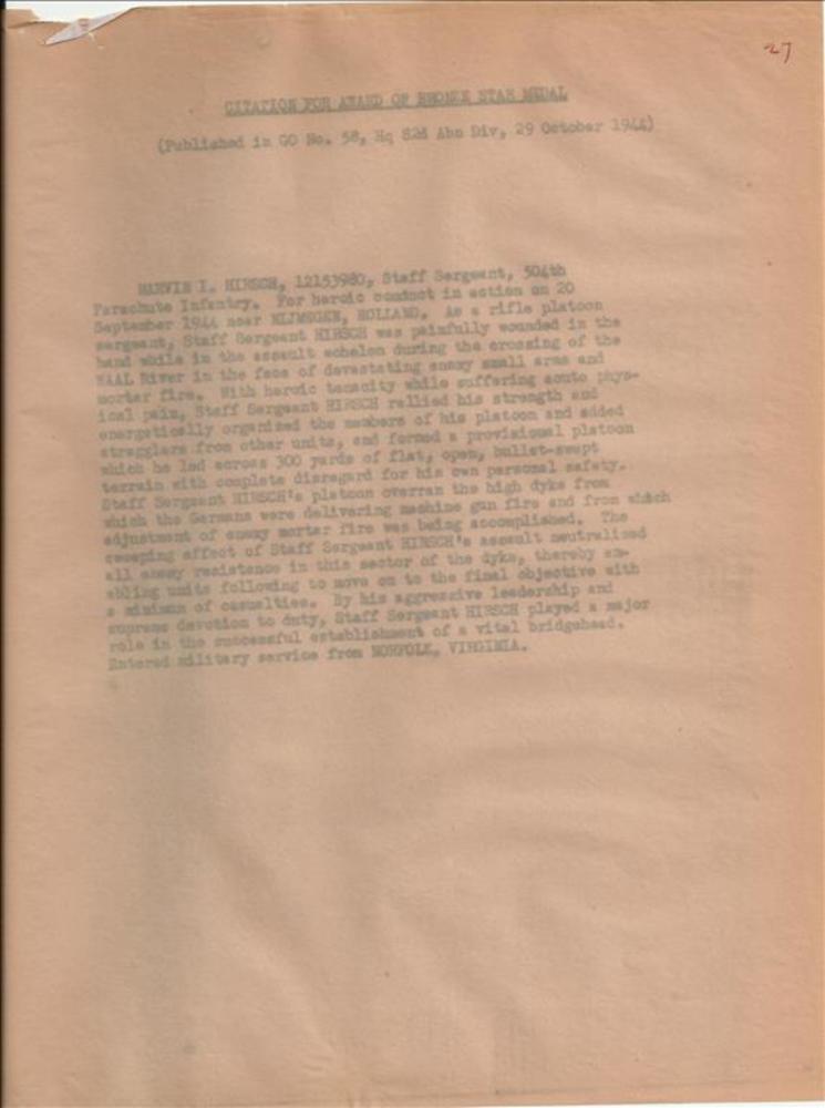 Citation for Bronze Star medal van Marvin I. Hirsch