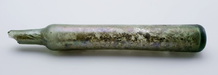 Zeer kleine buikfles met ondiepe ziel in groenig glas