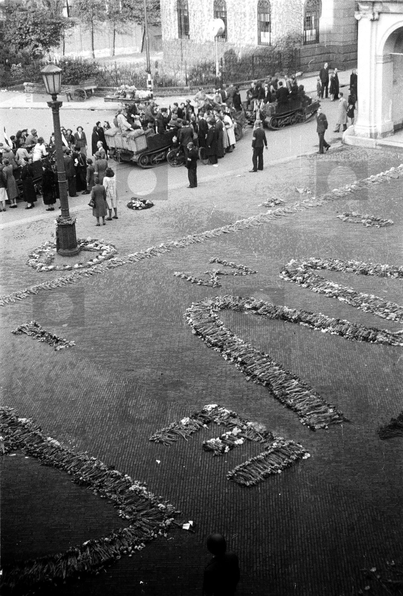 Geallieerde voertuigen rijden tijdens hun intocht vo...
