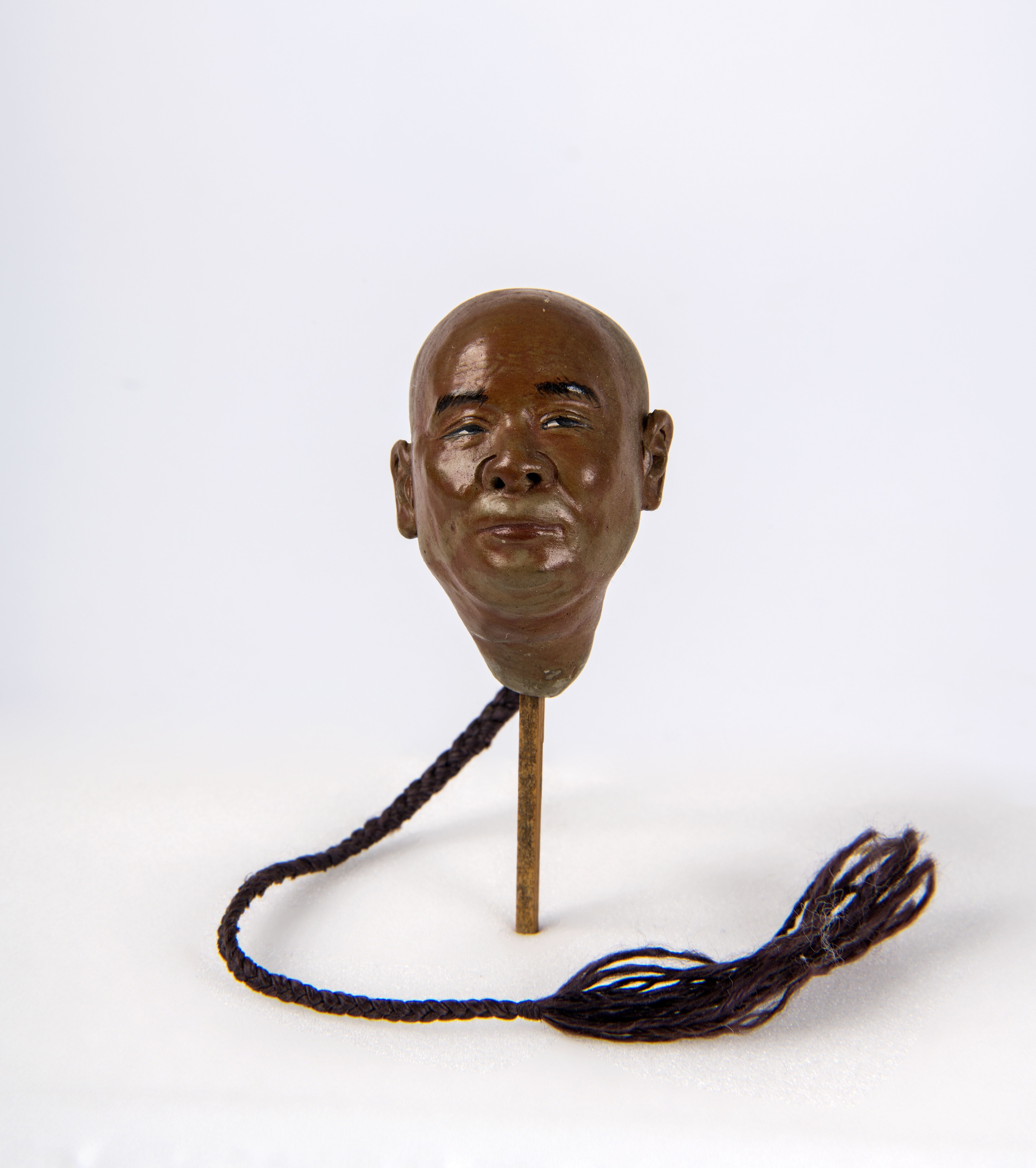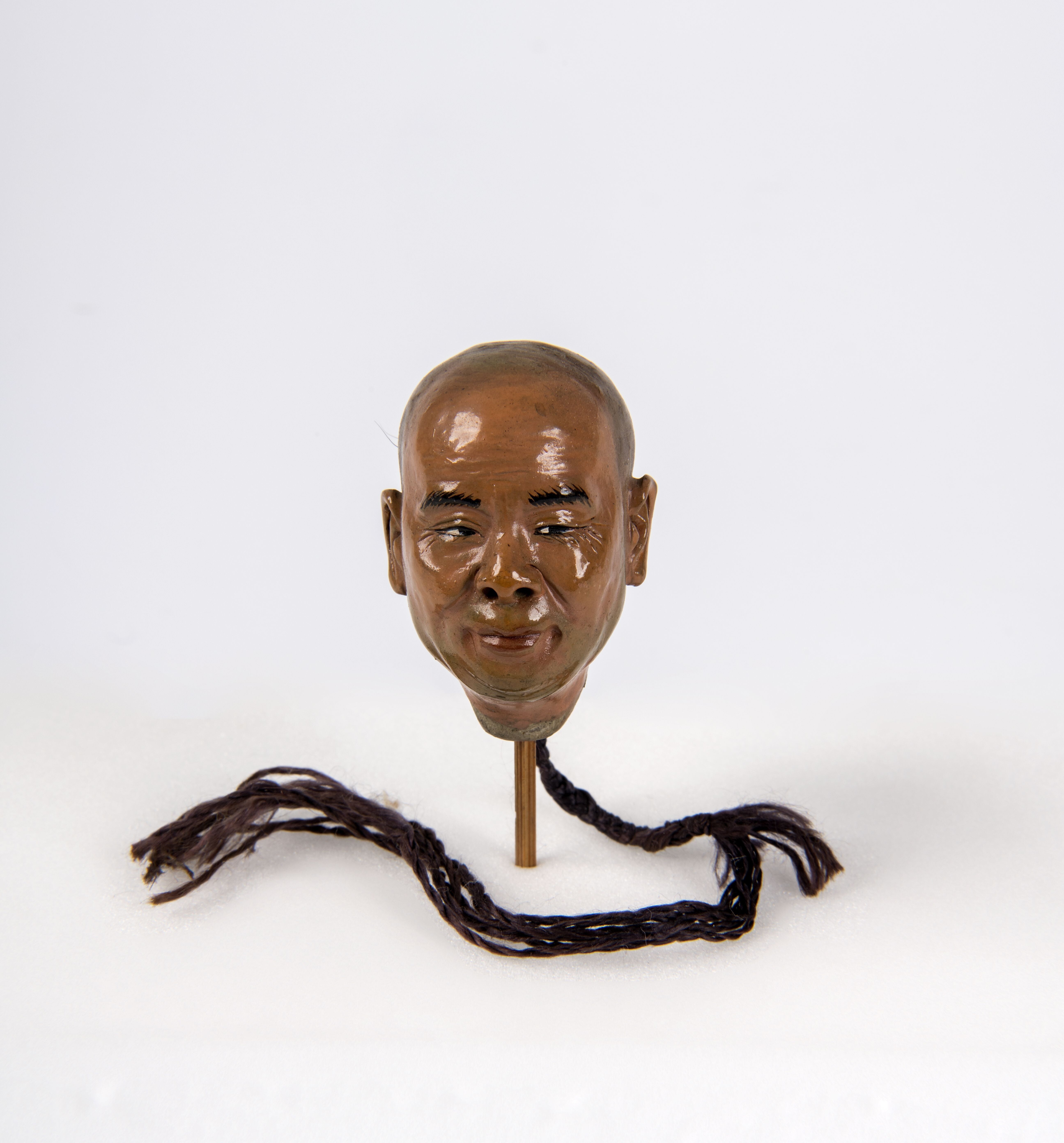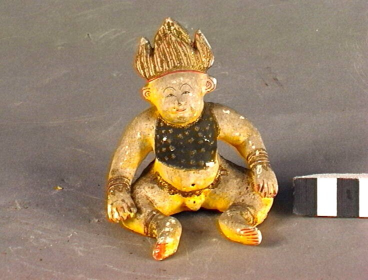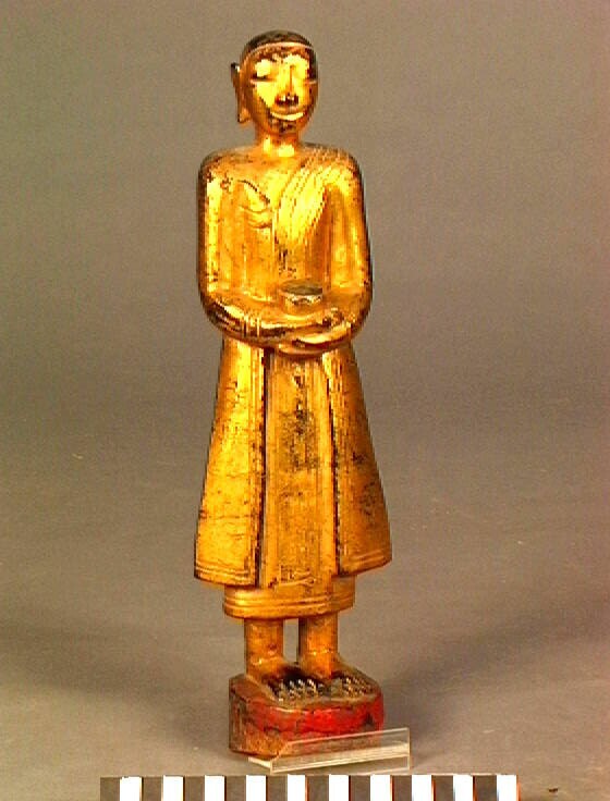 Een houten beeld van een discipel van Boeddha.