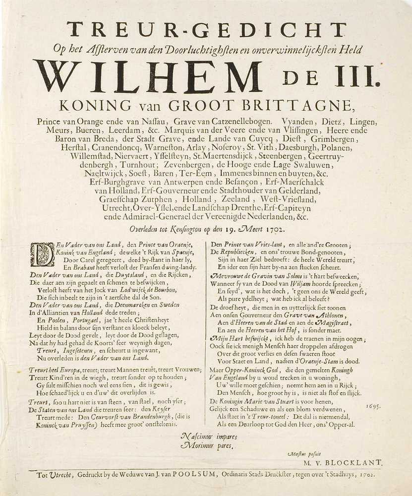 Treurgedicht Stadh. Koning Willem III (1650 - 1702)