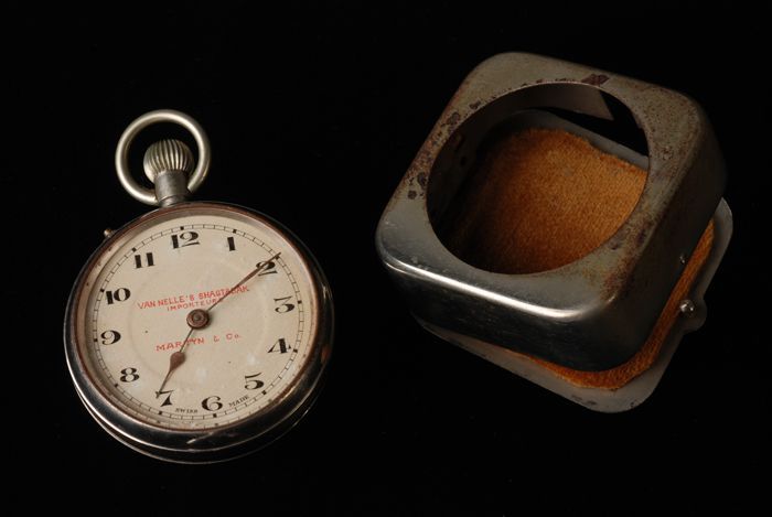 Zakhorloge in beschermkast, met opdruk op de wijzerp...