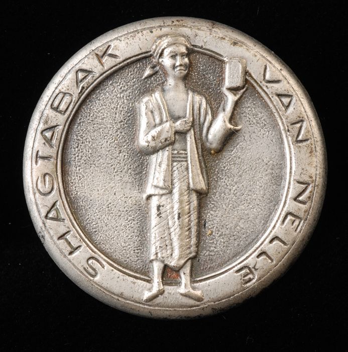 Metalen speld, waarop met vrouw met kanten muts en "...