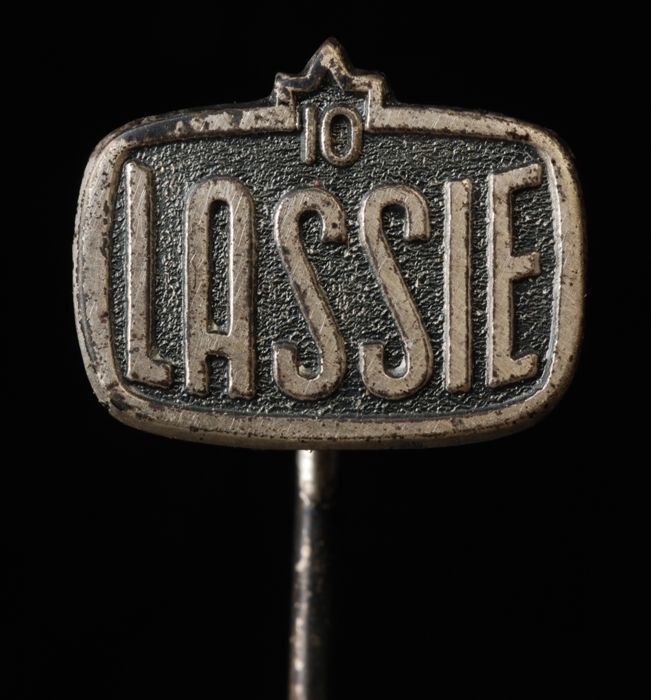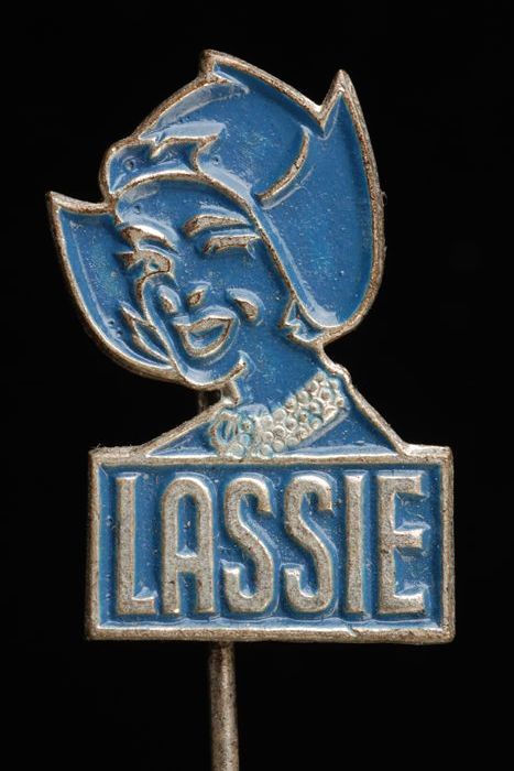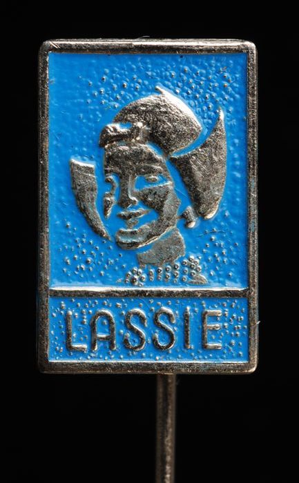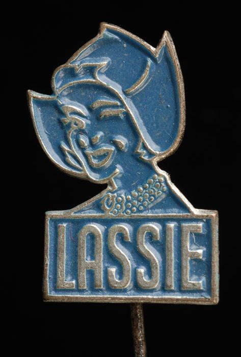 Metalen speld met vrouw met kanten muts en "Lassie"