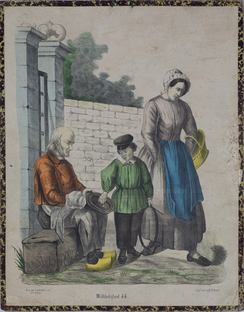 schoolplaat, milddadigheid. Kleurenplaat van blinde ...